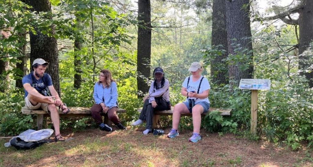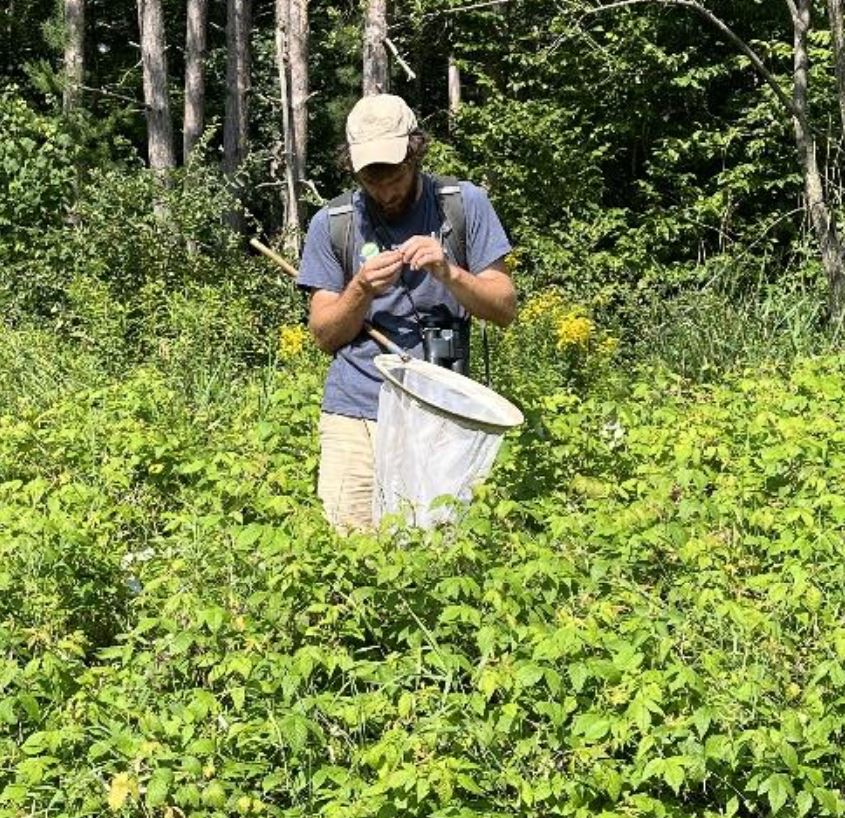 Eight people turned out for a fascinating walk with bee expert Spencer Hardy of the Vermont Center for Ecostudies. Spencer caught bees with a sweep net, to identify them and then, so we could look at them, placed them safely in a glass jar; then they were released unharmed. See the VCE website (At This Link and At This Link) for more information on the statewide census for bees, which Spencer is directing.