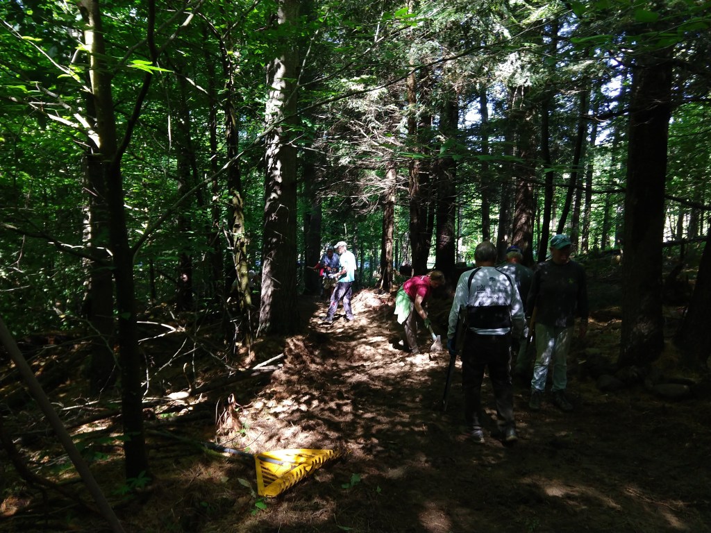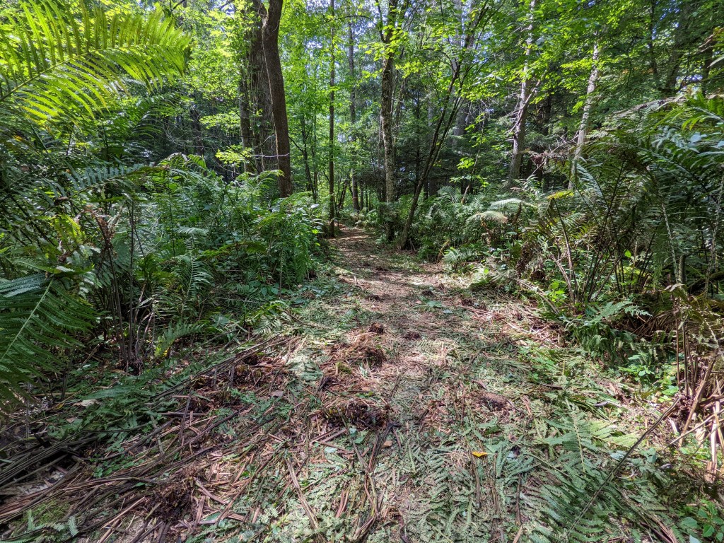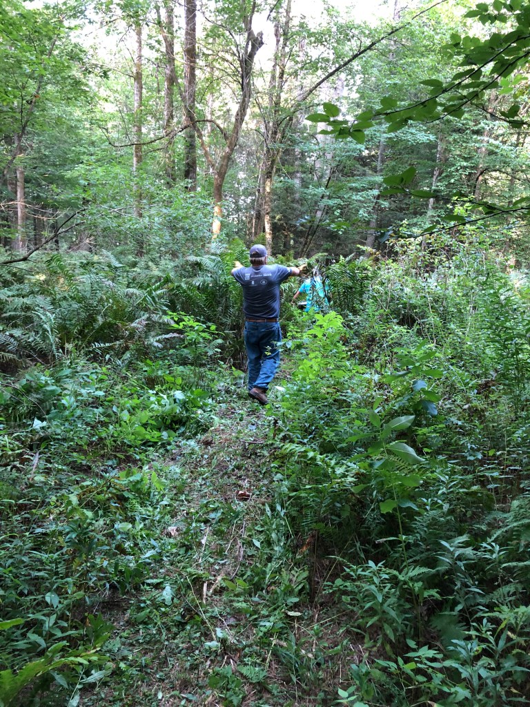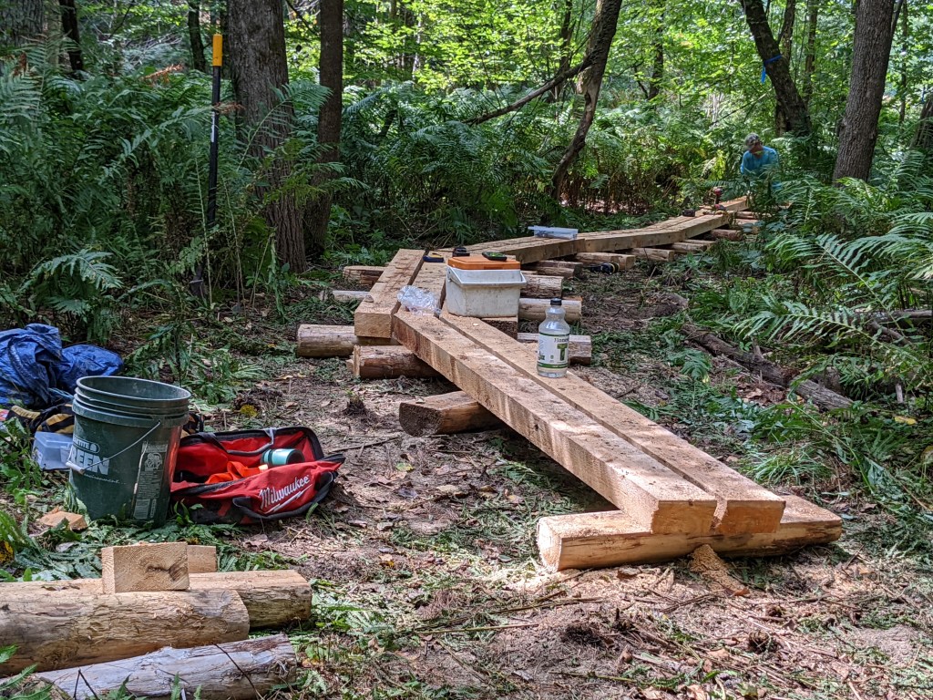 After an inspection by The Bovine Welcome Committee the route through the ferns was brush-hogged and cleared of fallen trees. The old board walk was lifted and hauled out. Greg Fatigate then went to work installing new cedar bog bridging.