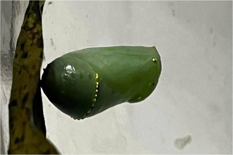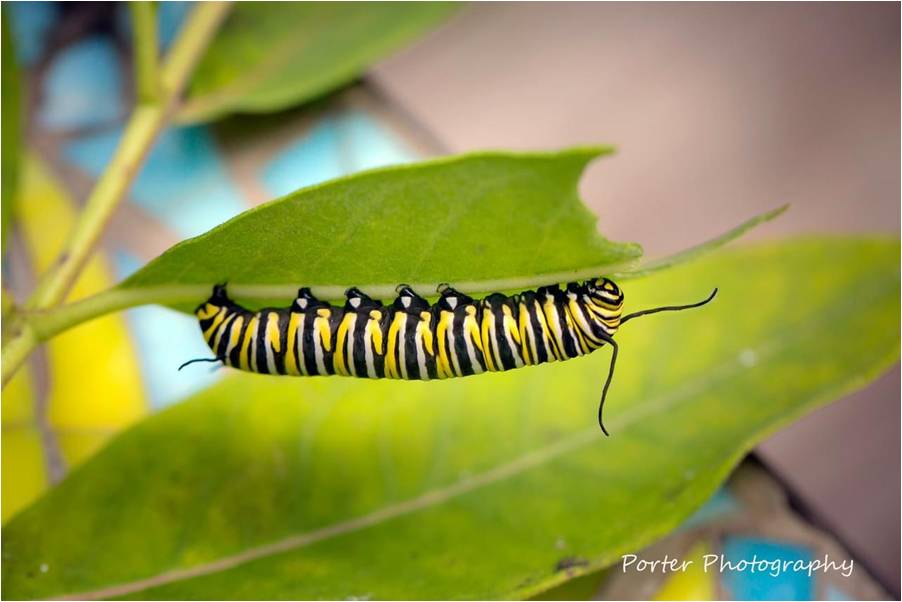 Below you see the development of a Monarch Butterfly from Caterpillar to Young Chrysalis to Mature Chrysalis (which becomes transparent so you can see inside) to the hatched Monarch. These pictures are of one single insect’s development. Click on the pictures to see a larger image.